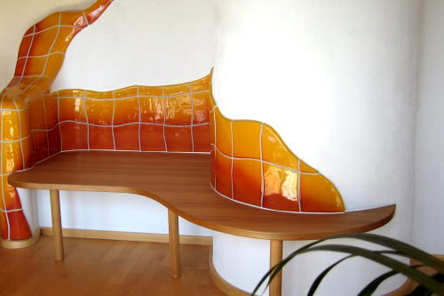 An die geschwungene Form des Kachelofens angepasste Ofenbank, Vollholzplatte mit 3mm Kirschholz-Sägefurnier belegt, Oberfläche geölt und gewachst
