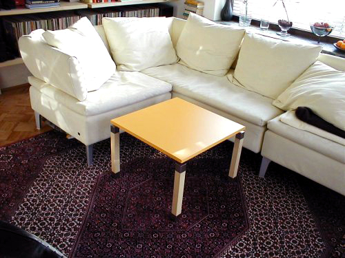 Wohnzimmer Couchtisch aus Ahornholz, Farbresopal und Edelstahl.