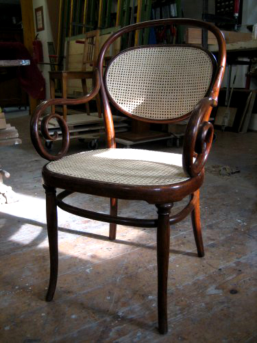 Bugholzfauteuil restauriert und neu mit Wiener Geflecht bespannt.