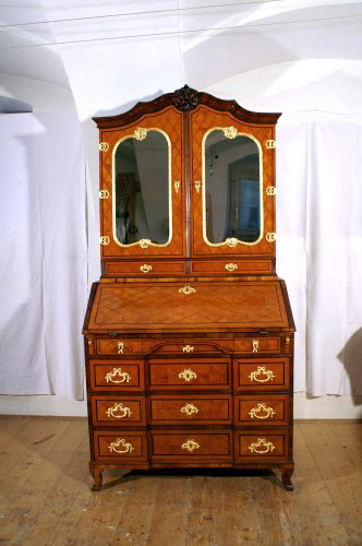 Nuss-, Zwetschgen- bzw. Pflaumenholz. Dreieck- und Bandmarketerien aus Kirschholz, mit vergoldeten Bronzebeschlägen. Nach Abnahme der bräunlichen Lasur-Oberfläche mit Schellack neu poliert.