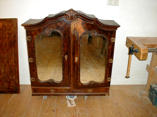 Die originale Oberfläche war durch bräunliche, unsachgemäß aufgetragene Lasur in Mitleidenschaft gezogen.