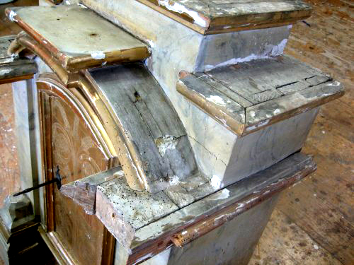 Ursprünglich starke Zerstörung durch Wassereinwirkung und Anobienbefall. Oberfläche beinahe zur Gänze abzutragen.