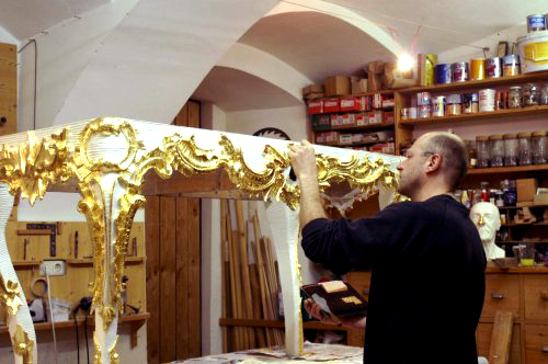 Tischlermeister und Restaurator Josef Lint beim Anschießen des Blattgoldes.