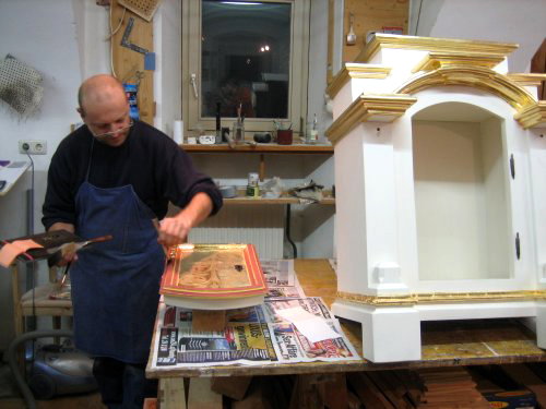 Auftragen der Netze vor dem Anschießen des Blattgoldes.