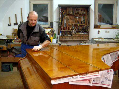 Auftragen der Schellackpolitur im Handverfahren mit Polierballen