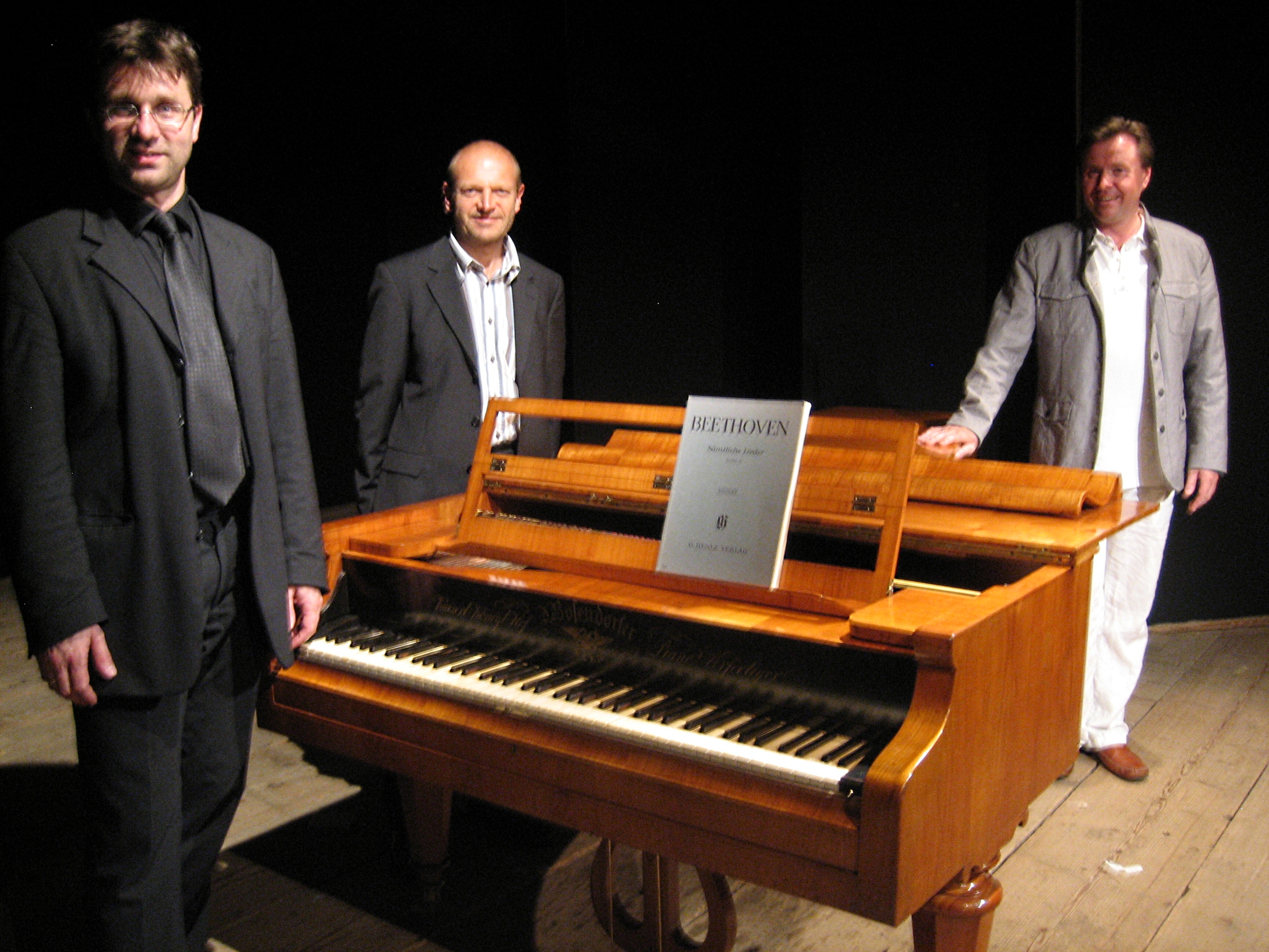 Von links nach rechts: Dr. Peter Deinhammer, Joesi Lint und Christian Havel bei der Präsentation des restaurierten Bösendorfer Hammerklaviers im Barocktheater.