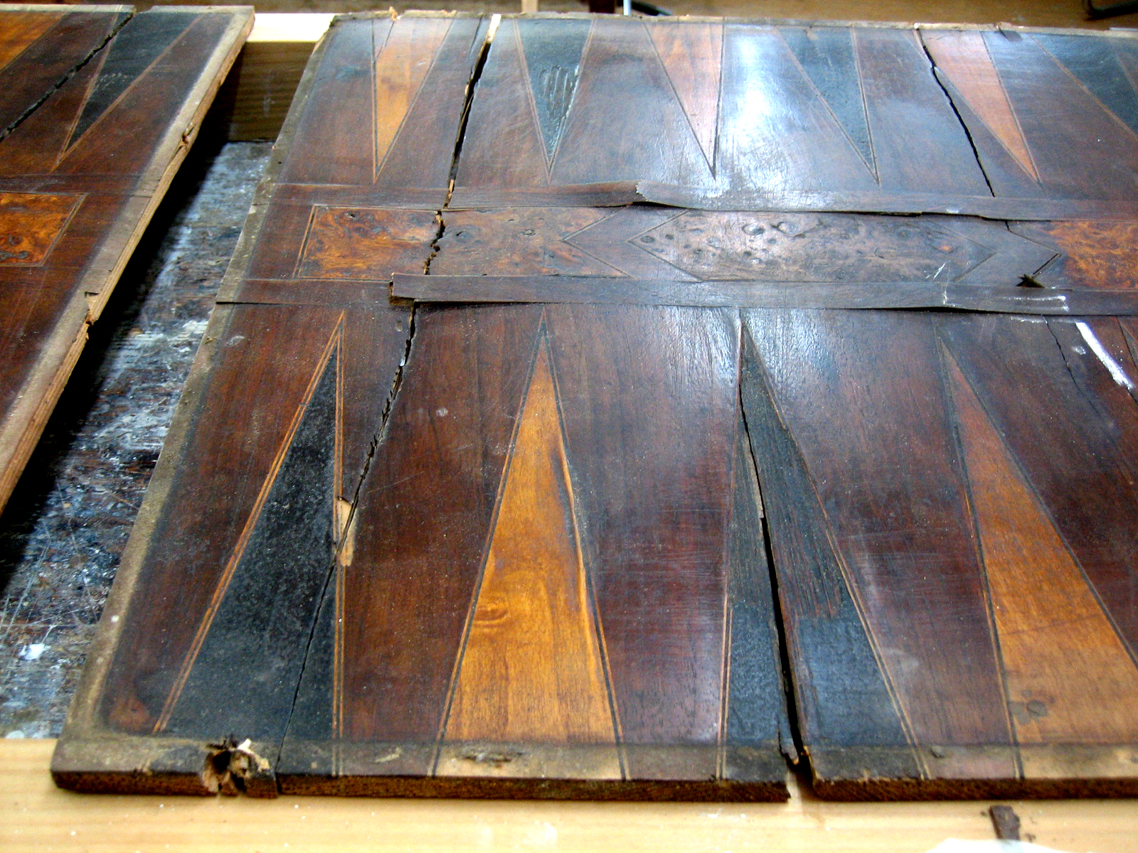 Beschädigtes Backgammon-Spielfeld vor der Restaurierung